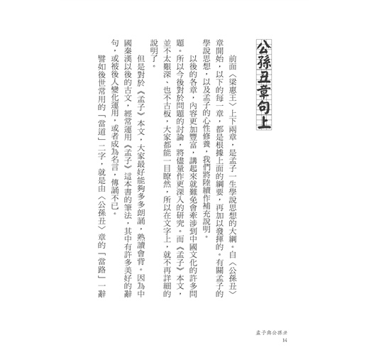 再者,本書雖為《孟子》的第二篇,由於各篇亦可單獨閱讀唸誦,故而另定書名為《孟子與公孫丑》。未來各篇,亦將各定書名,不再沿用《孟子旁通》原書名。