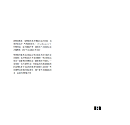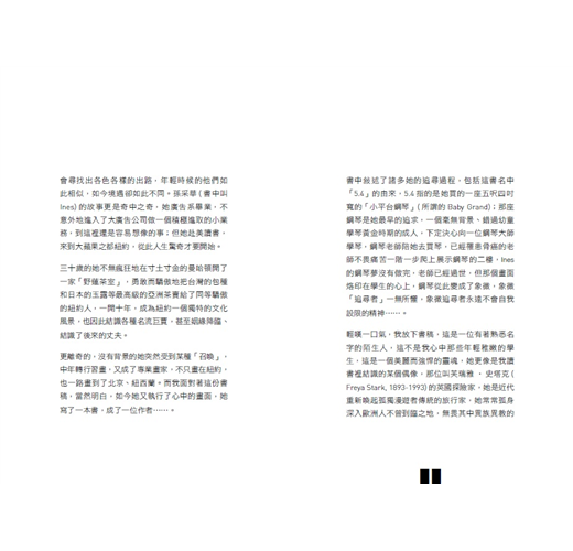輕嘆一口氣,我放下書稿,這是一位有著熟悉名字的陌生人,這不是我心中那些年輕稚嫩的學生,這是一個美麗而強悍的靈魂,她更像是我讀書裡結識的某個偶像,那位叫芙瑞雅‧史塔克(Freya Stark, 1893-1993)的英國探險家,她是近代重新喚起孤獨漫遊者傳統的旅行家,她常常孤身深入歐洲人不曾到臨之地,無畏其中異族異教的誤解與敵意,也無畏異鄉異壤的水土與疾病,她後來被稱為「大無畏探險家」(intrepid explorer);對我來說,這本書的作者,就是在人生旅途上啥米攏嘸驚、大步向前走的台灣女孩。
