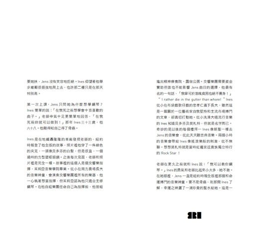 但是我看著我的學生,卻忍不住感到驚奇,生命會尋找出各色各樣的出路,年輕時候的他們如此相似,如今境遇卻如此不同。孫采華(書中叫Ines)的故事更是奇中之奇,她廣告系畢業,不意外地進入了大廣告公司做一個積極進取的小業務,到這裡還是容易想像的事;但她赴美讀書,來到大蘋果之都紐約,從此人生驚奇才要開始。