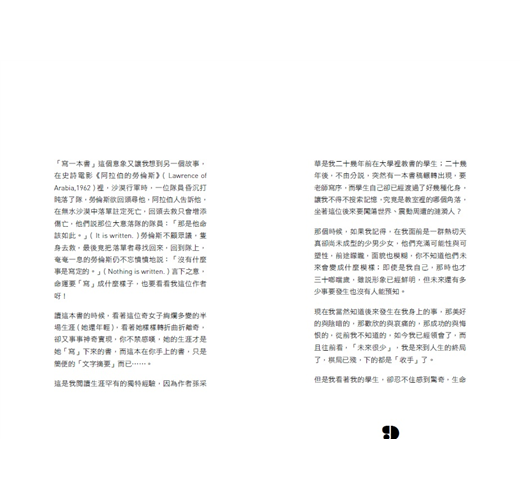 「寫一本書」這個意象又讓我想到另一個故事,在史詩電影《阿拉伯的勞倫斯》(Lawrence of Arabia,1962)裡,沙漠行軍時,一位隊員昏沈打盹落了隊,勞倫斯欲回頭尋他,阿拉伯人告訴他,在無水沙漠中落單註定死亡,回頭去救只會增添傷亡,他們說那位大意落隊的隊員:「那是他命該如此。」(It is written.)勞倫斯不顧眾議,隻身去救,最後竟把落單者尋找回來,回到隊上,奄奄一息的勞倫斯仍不忘憤憤地說:「沒有什麼事是寫定的。」(Nothing is written.)言下之意,命運要「寫」成什麼樣子,也要看看我這位作者呀!