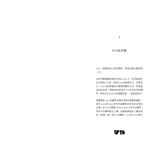 「5.4 指的是她買的一座五呎 四吋寬的『小平台鋼琴』; 那座鋼琴是她最早的追求,一個毫無背景、錯過幼童學琴黃金時期的成人,下定決心向一位鋼琴大師學琴,鋼琴老師陪她去買琴,已經罹患骨癌的老師不畏痛苦一階一步爬上展示鋼琴的二樓,Ines的鋼琴夢沒有做完,老師已經過世,但那個畫面烙印在學生的心上,鋼琴從此變成了象徵,象徵『追尋者』一無所懼,象徵追尋者永遠不會 自我設限的精神……。」 ~ 詹宏志