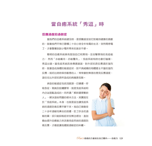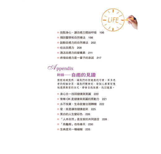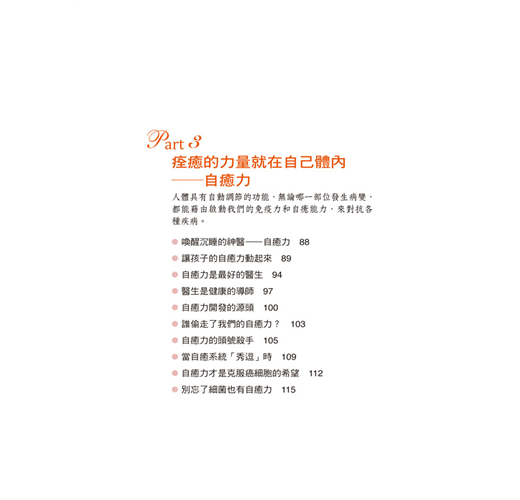 而我們所需要努力的,就是引導和激發這股力量,調整身體的防禦系統,並繼續維持這股自癒力的戰鬥力與聰明才智。只要能夠持之以恆,自癒力這個潛能就會成為你的親密愛人,善盡保衛身體的職責,成為身心靈健康的最大籌碼。