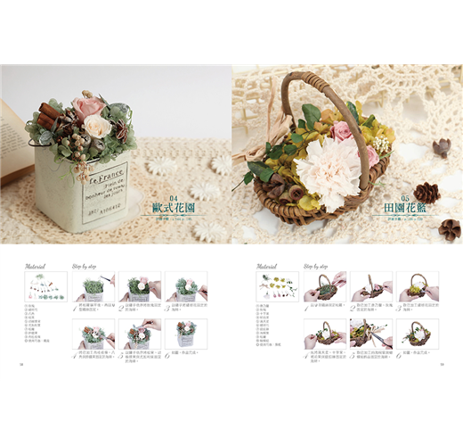 書中介紹以熱熔膠、白膠的開花技巧,及處理花材的鐵絲加工方法,並收錄以盆栽、籐圈等花器做出的花藝創作,讓你學會基礎製作外,更能運用花器設計出專屬作品。