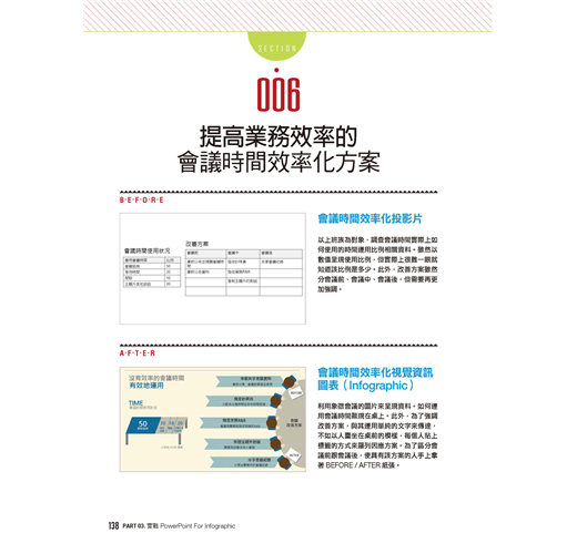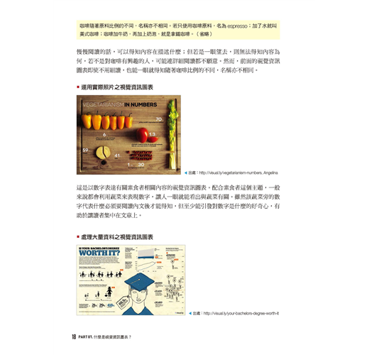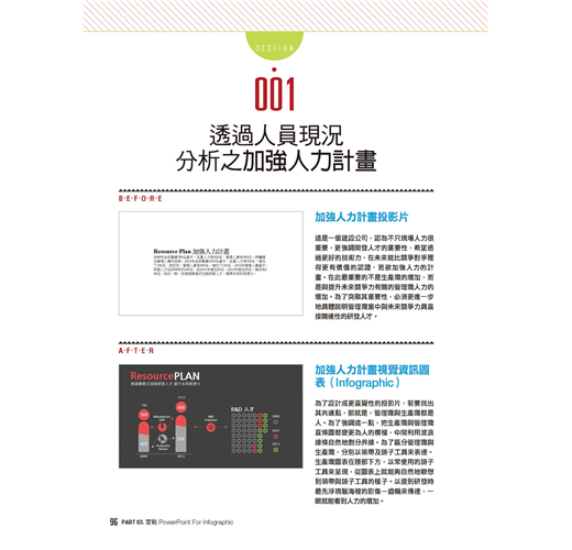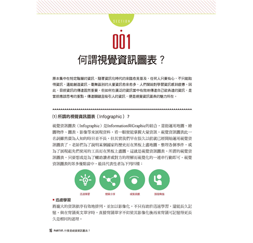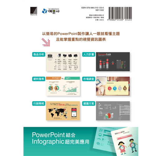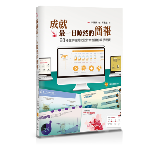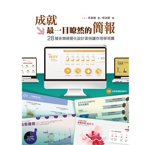 本書內容共分為三篇,第一篇闡述何謂視覺資訊圖表(infographic)與基本的製作過程;第二篇以分解步驟教讀者運用PowerPoint裡的功能,輕鬆製作豐富的圖表;第三篇則提供28個豐富案例,示範如何製作出各種主題與資訊的圖表。讀者若跟著本書範例加以練習,相信在不久的未來,在職場與學習的過程中更能提出比別人更豐富有力的提案與簡報!