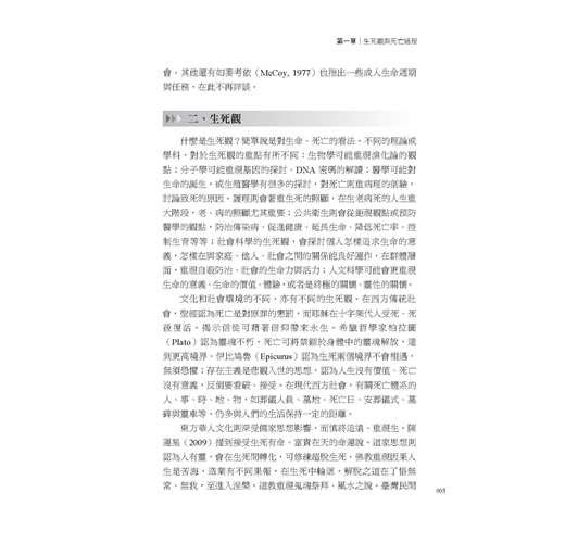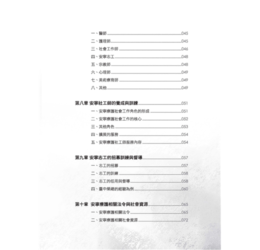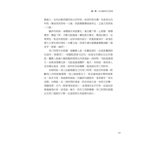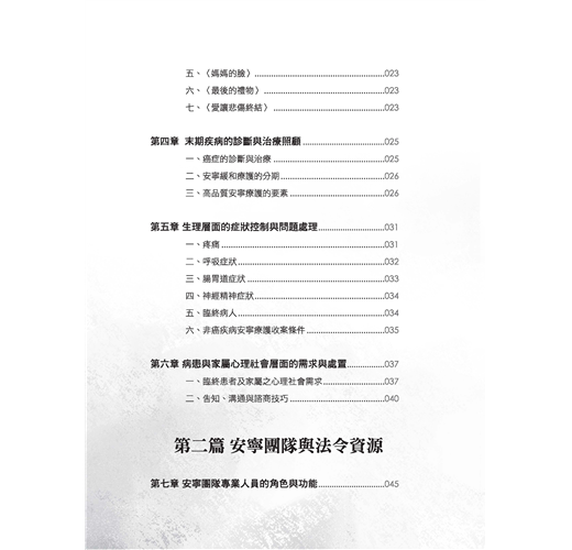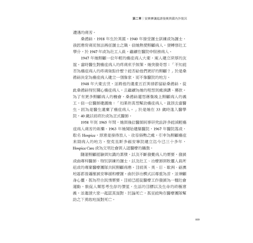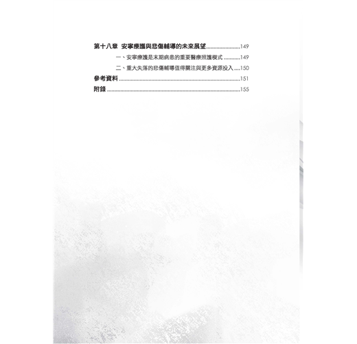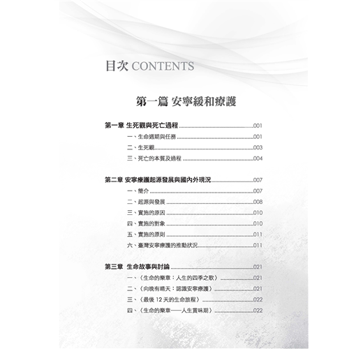 這本書提供給社會工作系的學生、安寧療護的志工、重症患者家屬,以及想要認識安寧療護和悲傷輔導的讀者們。全書分為三篇十八章。第一篇安寧緩和療護,探討生死觀、安寧療護的國內外發展、末期疾病診斷治療症狀控制、病患家屬的心理社會需求與處置。第二篇安寧團隊與法令資源,介紹團隊的專業人員角色任務,特別是社工師的養成與工作內容、志工招募訓練與督導、安寧緩和醫療條例及重要資源與網站。第三篇是悲傷輔導,介紹悲傷理論、哀悼歷程及悲傷輔導作法,延伸探討相關倫理議題、助人者的壓力調適等。