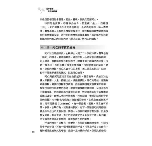 本書分為「安寧療護」與「悲傷輔導」兩大部分,第一部分詳盡介紹安寧療護的起源與發展、施行過程,以及安寧團隊人員如何照顧癌末病人與家屬的身心狀態,並解釋安寧團隊人員的角色與職責;第二部分從情緒著手,說明悲傷的發生、階段、類型,並提供利用支持團體與宗教,以面對、處理「悲傷」的方法。作者善用深入淺出的文字以及臺中榮總的實務經驗,希望藉此使讀者更加重視相關議題,並適當運用在生活、服務與工作上。