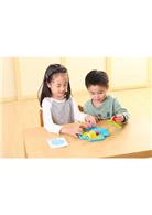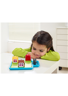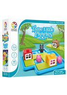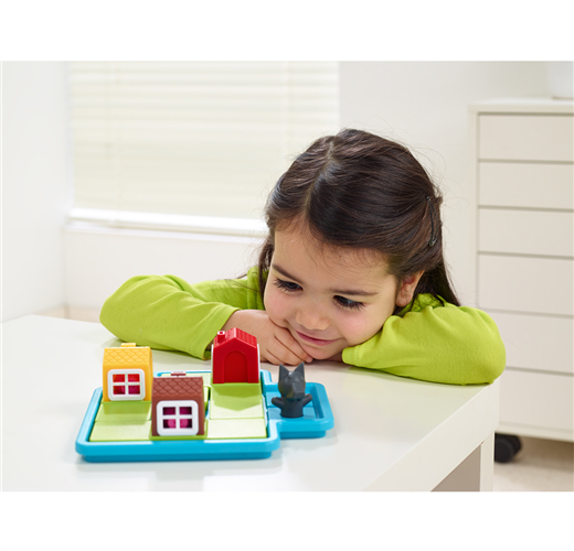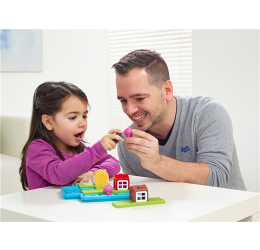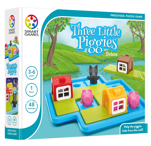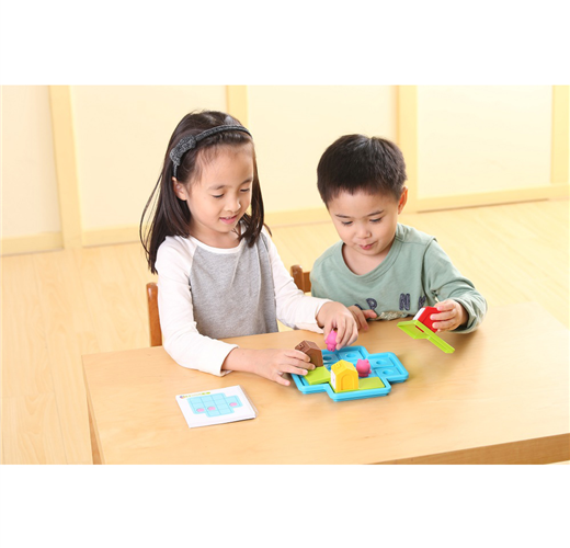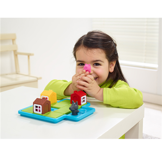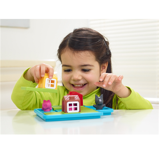 童話故事的情境延伸,讓幼兒容易理解遊戲規則,三隻小豬、大野狼主角偶與立體房屋的設計,讓學齡前的幼兒在操作時更具真實感。搭配白天小豬蓋房屋與夜晚躲避大野狼的情境,共48個遊戲關卡,由淺入深,提升幼兒視覺與空間概念並提升解決問題的能力。