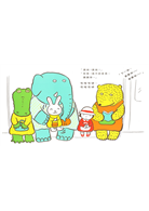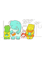 喀隆喀噠──喀隆喀噠──「象皮站、象皮站到了。」。好幾隻象上車了。下一站是什麼站呢?