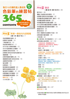 本書的特色即內容設定為1年365天的每日練習指南,不管從一年中的哪一天開始都沒關係,每天只要花10~30分鐘,跟著本書的日曆一天一點點地前進,不僅能夠每天享受繪圖的樂趣,還能夠看見自己的進步成長唷!內容從最基本的繪圖基礎到進階的應用練習,都是採循序漸近的方式來教給讀者,非常清楚明瞭、容易學習,相信不久後,你也能夠成為色鉛筆達人!