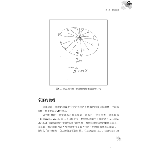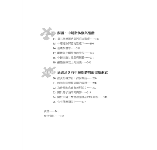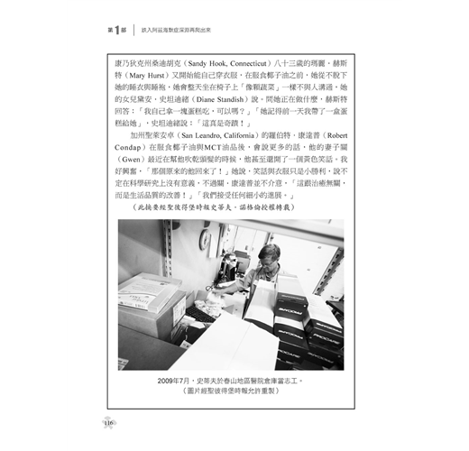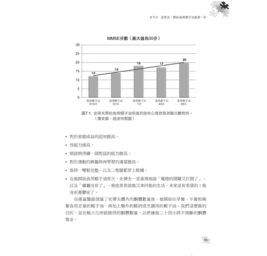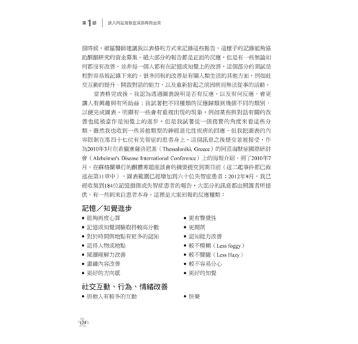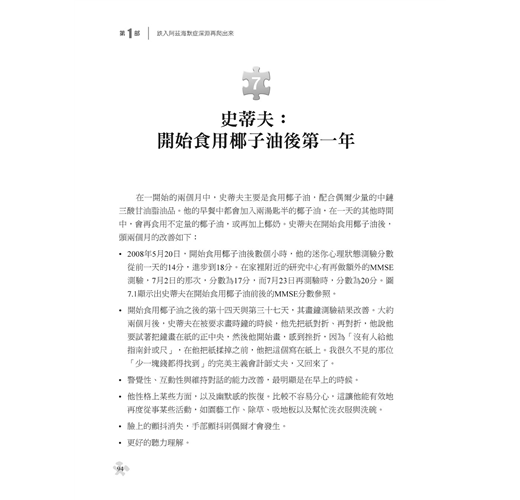 以患者的治療過程來解說椰子油對於阿茲海默症的功效,生活化的解說方式化解了詰屈聱牙的醫學術語,讓讀者更易了解治療原理與實際效果。