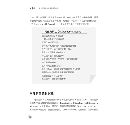 作者仔細紀錄丈夫罹患阿茲海默症後的反應與治療的方法,以及患者家屬應持有的態度和給予的奧援陪伴,兼具專業度與同理心。