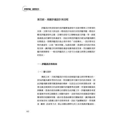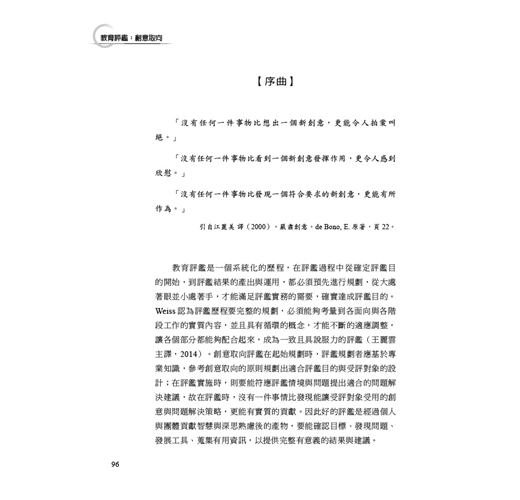 本書從探討創意與創造力之系統與內涵出發,透過文獻分析連結當代教育評鑑取向與模式,進一步參酌當前教育評鑑實務,歸納出教育評鑑的創意取向。