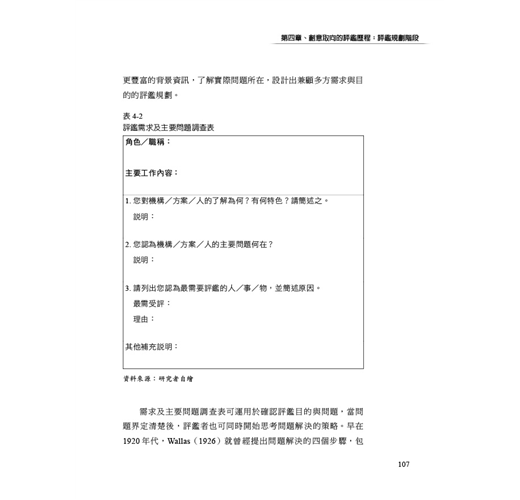 表4-3是評鑑設計時可運用的檢核工具,可協助評鑑規劃時更仔細的預先思考,列出所有必須考慮的選項,以利實際執行時需彈性修正時的參考。