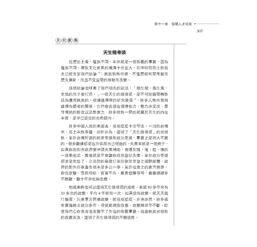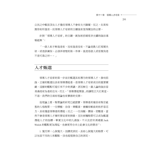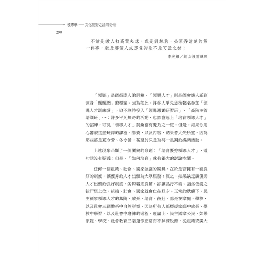 任何一個組織、社會、國家強盛的關鍵,在於是否擁有一套良好的制度,讓優秀的人才出頭為大眾服務;反之,如果缺乏讓優秀人才出頭的良好制度,劣幣驅逐良幣,卻讓品行不端、拙劣低能之徒尸居上位,組織、社會、國家就會亡在旦夕。針對「領導人才培育」的主題,新加坡前總理李光耀的說法堪稱經典: