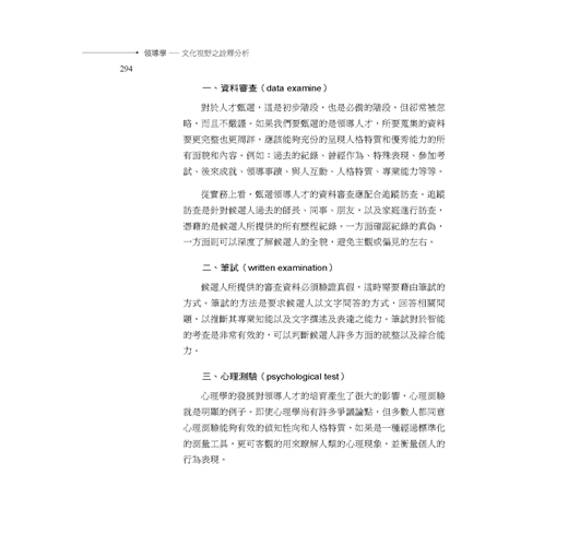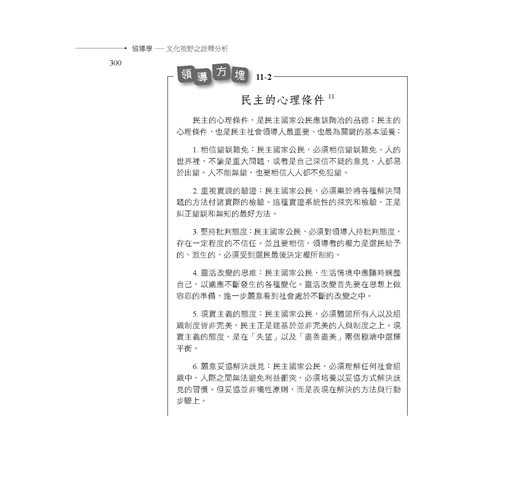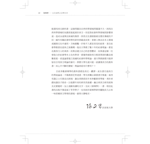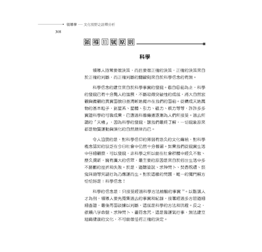 本書方向有三:一是科學方法,意味著要符合科學的判斷和規準,不是道聽塗說、斷章取義,或東拼西湊:二是融入東方文化視野的觀點,以詮釋領導的相關議題,避免踏入自我學術殖民的泥淖;三是以理性批判的態度,平等面對西方或本土的研究觀點。