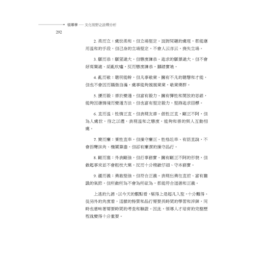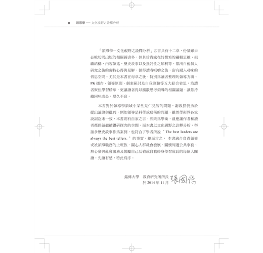 本書對於領導學領域中某些見仁見智的問題,謝教授仍勇於提出論證與批判,例如領導是科學或藝術的問題,雖然學術界各家說詞迄未一致,本書則有自家之言,然既為學術,就應讓作者和讀者都保留繼續鑽研探究的空間。而本書以文化視野之詮釋分析,舉諸多歷史故事作為案例,也符合了學者所說“ The best leaders are always the best tellers. ”的事實。總而言之, 本書適合負責領導或被領導職務的上班族、關心人群社會發展、關懷周遭公共事務、熱心參與社會服務及愓勵自己反省或自我終身學習成長的每個人閱讀。先讀有感,特此為序。