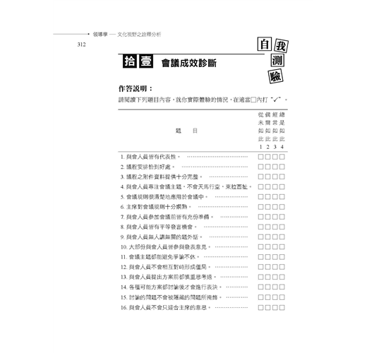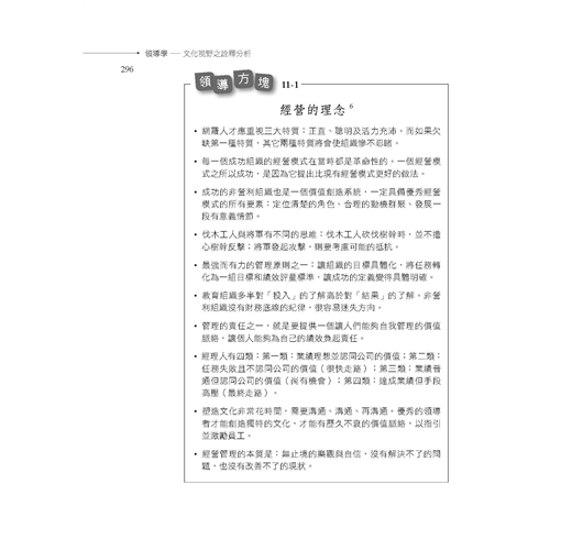 「領導學—文化視野之詮釋分析」乙書共有十二章,份量雖未必較坊間出版的相關圖書多,但其珍貴處在於撰寫的邏輯思維、組織結構、內容陳述、歷史故事以及批判性之犀利等,都出自他個人研究之後的獨特心得與見解,值得讀者咀嚼之後,留有耐人尋味的省思空間。尤其是本書在每章之後,特別為讀者整理的領導方塊、PK擂台、領導原則、個案研討及自我測驗等五大綜合省思,為讀者聚焦學習精華,更讓讀者得以擴散思考領導的相關議題,讓您持續回味成長,歷久不衰。