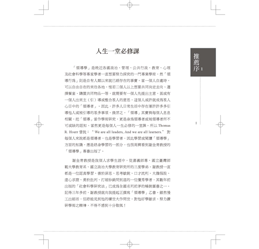 目前多數領導學的教科書都是西文、翻譯,或全書引述西方的學說論述,不僅教授茫然迷惑,學生則難以領會書中要義,亟待有識之士引領走出困境。謝金青教授長年來奉獻教育學術,勇於承擔知識份子使命,以他歷年來的研究為基礎,融合東西方研究經典及史實題材,加上淺顯易讀的文字,完成《領導學》一書。相信此書的出版不僅造福了莘莘學子,也有助於領導學研究擺脫長久以來一味仰賴西方學理的窘境,值得大聲喝采。
