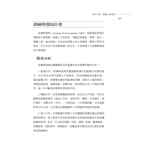 訓練與發展(training & development, T&D)是組織社群進步現象的主要特徵。領導人才的培育,焦點宜著重在:特質、能力、意願三者。