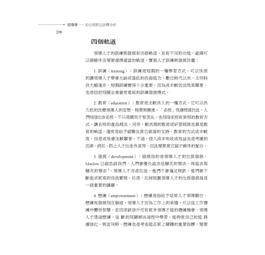 領導人才的訓練與發展有四個軌道,並有不同的功能,組織可以視條件及需要選擇適當的軌道,實施人才訓練與發展計畫: