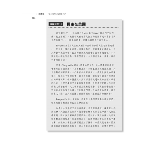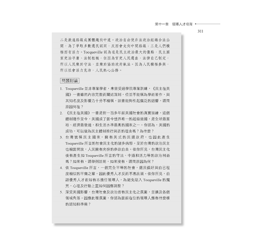 1. Tocqueville並非專業學者,未曾受過學院專業訓練,《民主在美國》一書雖然內容完整而闡述深刻,但並不能稱為學術著作,與其知名度及影響力十分不相稱,該書能夠引起廣泛的迴響,請問原因何在?