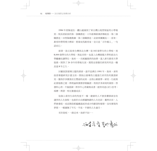 教育工作三十年,長期以「領導行為」為學術研究主軸。與此同時,從基層到大學,未曾間斷行政服務,得以在教學與工作之餘,將領論與實務交相印證。