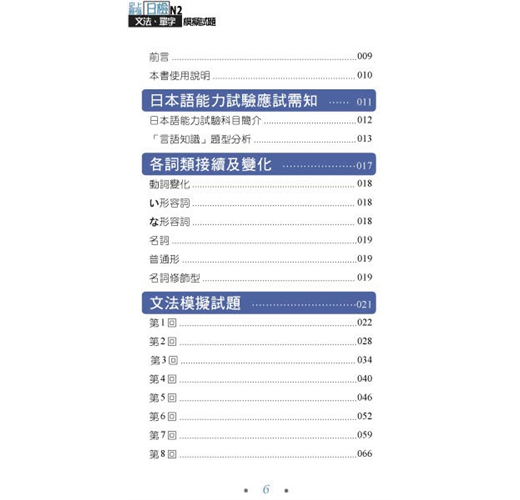本書分為文法模擬試題及文字語彙模擬試題兩大部分,分別對應日本語能力試驗N2的「言語知識(文法)」及「言語知識(文字‧語彙)」。建議先參照「題型分析」之章節後再進行模擬試題作答。