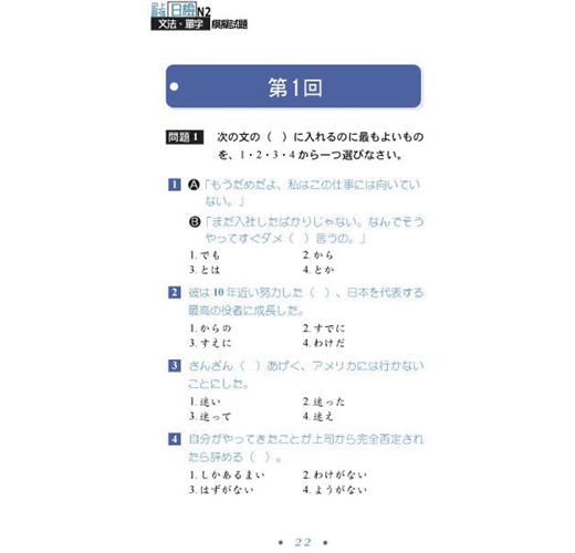 N2單字模擬試題每回包含6個部分。第1部分是漢字讀音;第2部分是漢字寫法;第3部分是語彙結構;第4部分是文...