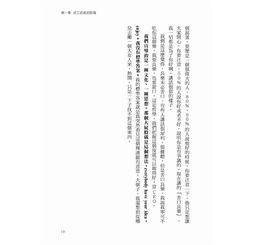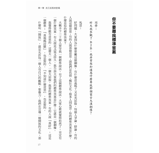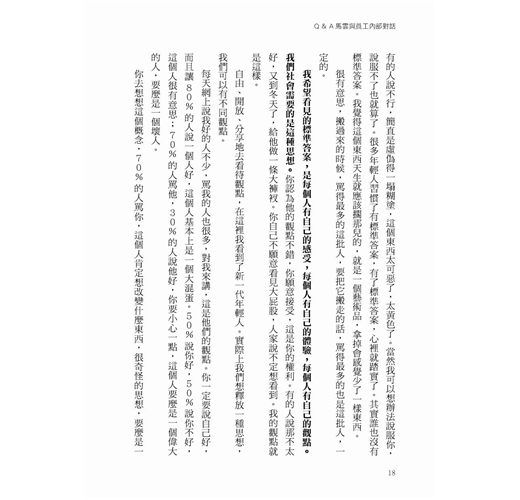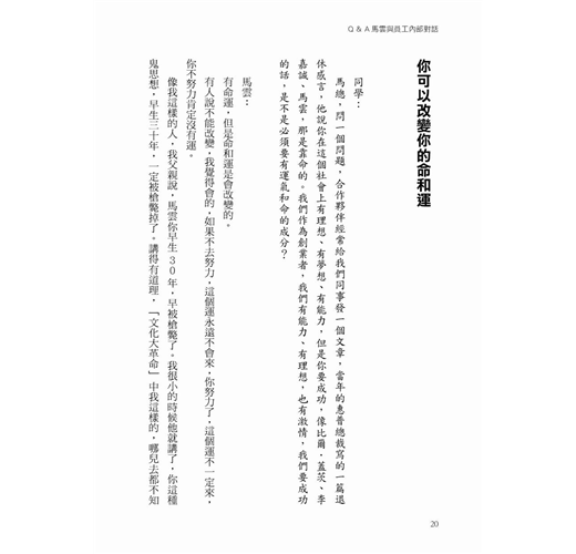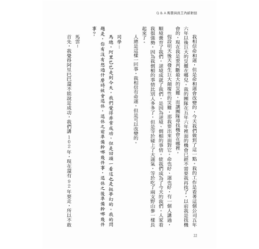 本書編輯從紛繁的言詞中,選擇第二人稱「你」作為切入視角,以此希望作為讀者的你,可以更貼近地去感受「Q & A」,的氛圍。此外,本書還收錄了兩篇訪談。跟隨訪談者之間,我們可以更全面地感知馬雲的心路。