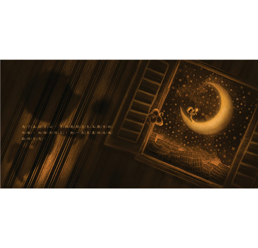 為了突顯夜空中皎潔的月亮,畫家僅用了黑色和溫暖的黃銅色,營造類似黑光劇的效果,也像是背後有光線穿透了黑暗。除了月亮放光外,珍珠和鑽石也顯得晶瑩、透亮,而同樣閃閃發光的,還有男孩心碎時滴下的眼淚,這樣呈現圖像的方式在圖畫書裡並不多見。白晝出現的跨頁是整本書中唯一的彩色頁,由於和前一跨頁的構圖相同,更加強翻頁的對比效果,讓讀者跟月亮一起感受驚喜。