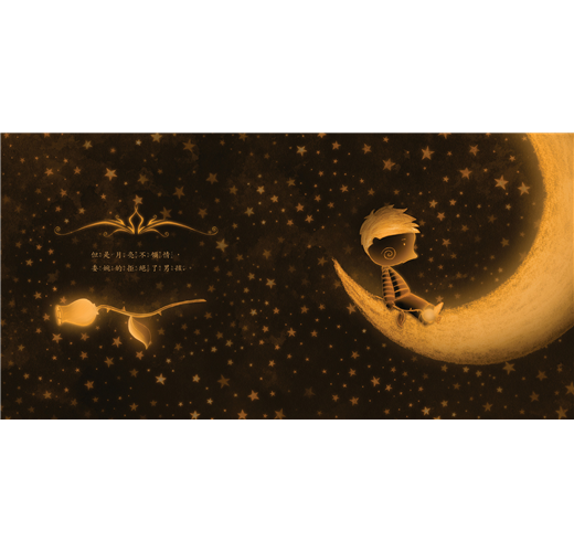 男孩不放棄,他橫越洶湧的大海,想找尋真正稀奇的東西,用它打動月亮的心。