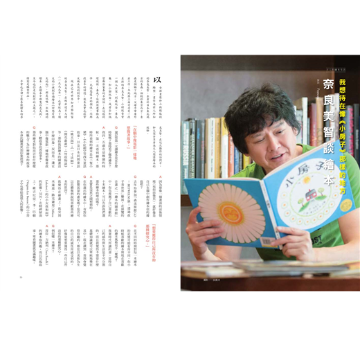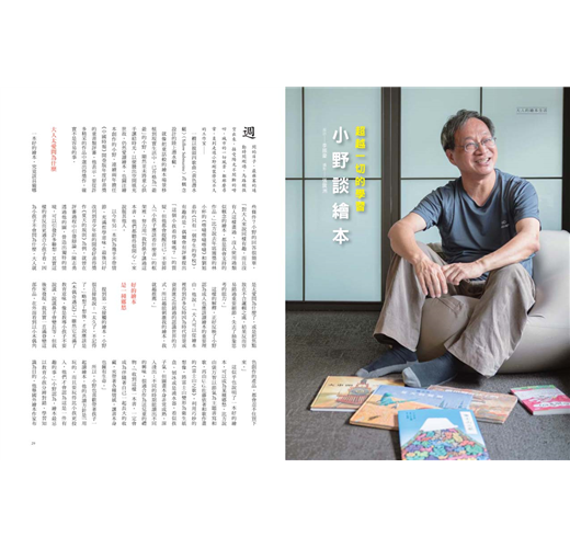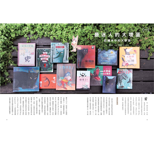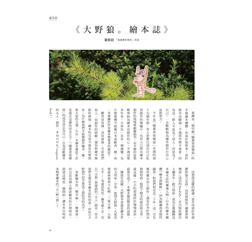 創刊號特別邀請臺日繪本作家,披露不為人知的「繪本作家(愚蠢)的一天」!此外,繪本專家、「小茉莉親子共讀」的顏銘新,為讀者仔細爬梳繪本中大野狼的不同面目。專題「大人的繪本生活」中,獨家訪問到日本藝術家奈良美智,談論影響他最大的繪本;奈良美智並且非常難得地提供了家中書架的照片,讓讀者一窺他的書收藏。此外,作家小野也侃侃而談他覺得好繪本的條件是什麼。兩人分別從圖畫和故事,分享大人繪本愛好者的心情。
