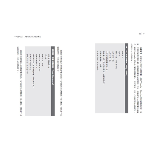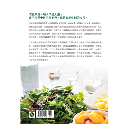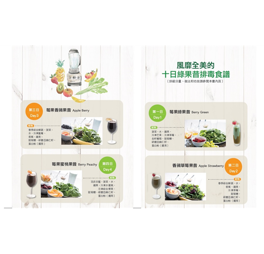 為什麼設計綠果昔十日排毒療法? 雖然我已實踐了好幾年的淨體、健康飲食和排毒療法,但就在去年,我因為補牙使用了銀粉的填充物造成汞中毒而臥床不起!我的大腦、腸道、肝臟及腎臟皆驗出含有大量的汞,讓我有兩個月左右的時間必須在床上度過,當我終於得以下床時,我又把床鋪好躺回去休息!當時我的健康、體力和行動力都處於極差的狀態。 經過去年一段漫長的恢復期後,我決定想辦法讓自己回復原有的健康及活力,還要減去臥床期間體重增加的九公斤。在我得知生蔬有讓身體恢復元氣的力量後,我就設計了這套綠色冰沙十日排毒療法。而且,身為一個提倡體內排毒的代言人,我知道由於汞中毒的關係,體內累積了過量廢物與毒素,我必須將其排除乾淨才行。 我一設計出綠果昔排毒療法後,便詢問周遭親友,看看是否能找到十個人一同加入排毒的行列,發現有將近一百個人願意和我共同奮鬥,讓我又驚又喜!我們創建了一個Facebook粉絲專頁互相激勵,因為減重效果驚人,不到兩個月,就有上萬人加入我們的粉絲專業,決定一同加入排毒的行列。在短短十天內,大家都瘦了五到七公斤不等,感到活力充沛,不僅改善自身的健康狀況,還變得比過去幾年更為健康。 當我完成第一次的排毒療法後,我總共瘦了五公斤,體力變好了,肌膚變得光澤亮麗,消化系統和脹氣的狀況也有改善,感覺就像重獲新生,又有前進的動力一樣!在我開始進行排毒療法前,一天要補充二十四種補品,讓身體從汞中毒的狀態中復原。自從做完一整套療法後,我現在一天只需要補充四種就夠了。我外表看起來容光煥發,期待能盡早回到追尋夢想和目標的軌道上。 綠果昔十日排毒療法是一個體內排毒計畫,能幫助減重、增強體力、減少食慾,並改善整體健康。在十天內,你會捨棄某些特定的食物,重建味蕾習慣,渴望攝取健康、營養豐富的食物。完成排毒療法後,你再也不需要計算卡路里,實施複雜、昂貴的食療減肥法或進行飲食的營養管理。你的身體會很自然的渴求健康、天然的食物。 在進行綠果昔十日排毒療法期間,在將細胞和體內毒素排除的同時,你會給予自己的身體優質的營養。你的身體能更有效的吸收維生素、礦物質和其他進行綠果昔十日排毒療法期間,在排掉聚積在細胞及體內的毒素的同時,你也讓身體吸收了優質的營養,使其能更有效地吸收維生素、礦物質和其他營養素,活化細胞,導致外表變得年輕,充滿活力。讓我們老化的元凶是囤積體內的廢物,這是抗老面霜和整容手術都無法與之抗衡的。當細胞變得健康、緊緻,你的外表也會看起來變得年輕許多,皮膚老化、暗沉、乾燥、浮腫、黑眼圈還有皺紋將會日漸消褪,有可能看起來比十年前還年輕,你會感覺自己回復青春,而非老化!總而言之,本書會教你如何從體內開始變得年輕、有活力。 第一日:漿果綠果昔(Berry Green) 菠菜3把 水2杯 蘋果1顆,去核後切片 冷凍芒果1杯 冷凍草莓1杯 冷凍或新鮮去籽葡萄一把 甜菊糖1包(想再甜一點,就酌量添加) 亞麻籽2茶匙 可加可不加:蛋白粉1勺 將綠色菜葉和飲水放進調理機內打碎,形成綠果汁的濃度後,停止攪動,再把剩下的材料放進去,充分打至稠狀即可。 第二日:蘋果草莓果昔(Apple Strawberry) 春季綜合鮮蔬3把 水2杯 香蕉1根,去皮 蘋果2顆,去核後切片 冷凍草莓1½杯 甜菊糖2包(想再甜一點,就酌量添加) 亞麻籽2茶匙 可加可不加:蛋白粉1勺 將綠色菜葉和飲水放進調理機內打碎,形成綠果汁的濃度後,停止攪動,再把剩下的材料放進去,充分打至稠狀即可。
