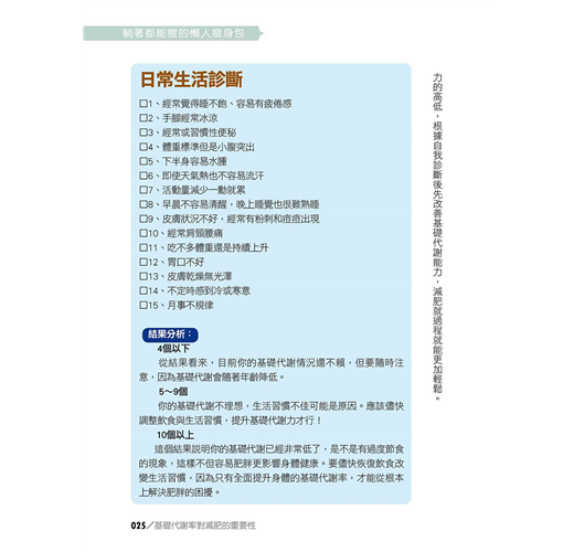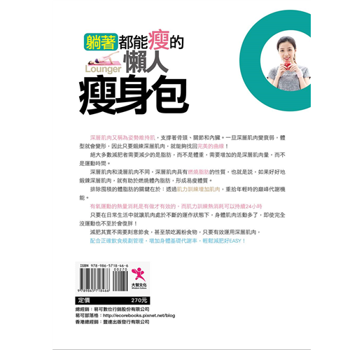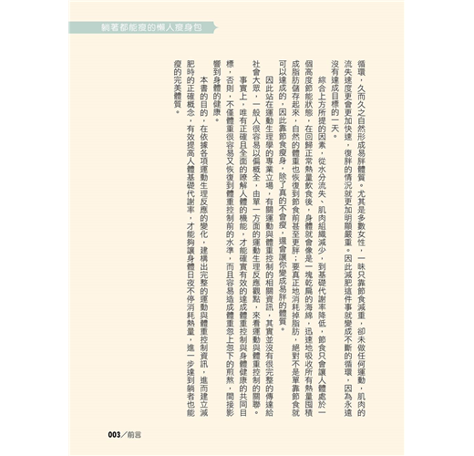 本書的目的,在依據各項運動生理反應的變化,建構出完整的運動與體重控制資訊,進而建立減肥時的正確概念,有效提高人體基礎代謝率,才能夠讓身體日夜不停消耗熱量,進一步達到躺者也能瘦的完美體質。
