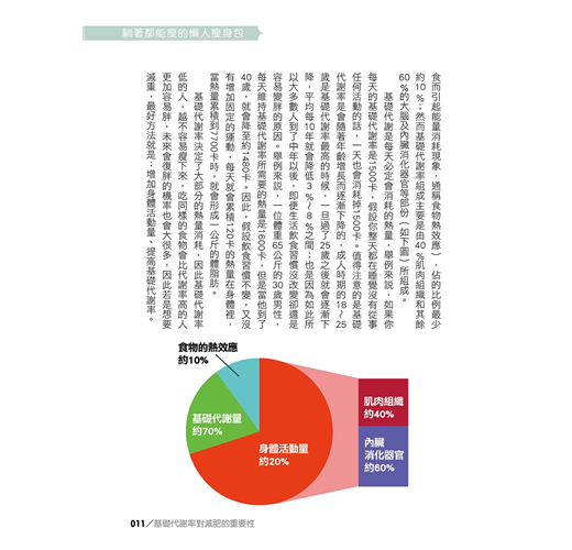 人體每天需要的總熱量主要有三個部分,第一部分就是基礎代謝率,約佔了人體總熱量消耗的70%,第二部分是身體活動及運動量,約佔總熱量消耗的20%,第三部分是食物的熱效應(食物熱效應定義是指:凡是吃飯的所有行為,夾菜、咀嚼、餚湯等動作,這些由進食而引起能量消耗現象,通稱食物熱效應),佔的比例最少約10%;然而基礎代謝率組成主要是由40%肌肉組織和其餘60%的大腦及內臟消化器官等部份(如下圖)所組成。