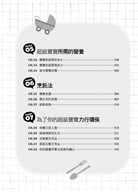 《超級嬰幼兒副食聖經》一書,分為七大主題四十二章,告訴現代父母育兒方法與解決照顧嬰幼兒可能會遇到的問題細節,各章重點內容如下: