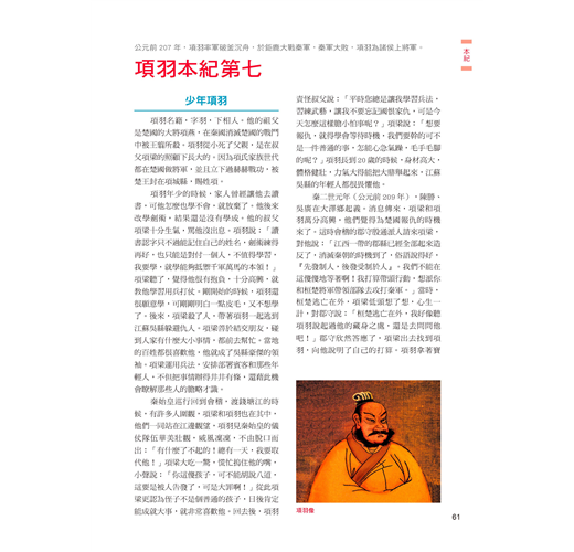 依循史記原著歷史脈絡,節選集結精彩故事,讓人愈讀愈有趣味,引發興趣的同時,更能在不知不覺中留下深刻印象,徜徉在本書當中,學習歷史零負擔。