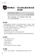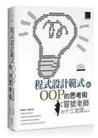 本書非常強調學習方法和學習精神的重要性,全文共有十三個章節,分為上、下篇。上篇以程式設計範式為出發點,深入分析各種程式語言的本質、特性、意義、優缺點,破除一般人對於程式語言的迷思;下篇則以抽象機制為出發點,徹底剖析物件導向程式設計的三大特性 ─ 封裝、繼承、多型,引領讀者真正掌握OOP的思考術,並將這些觀念延伸到設計原則與設計模式中。