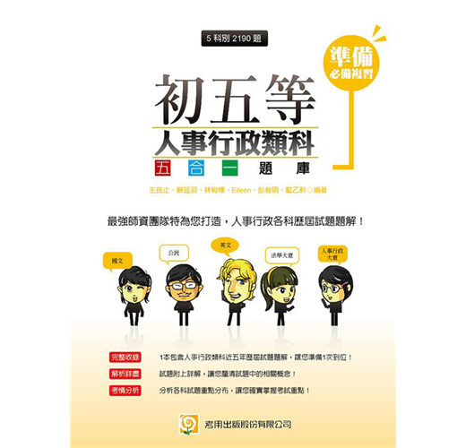 ◎收錄初五等考試人事行政類科—國文、公民、英文、法學大意、人事行政大意,近五年試題及詳解!