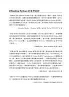 「Slatkin 的《Effective Python》中每個主題都是自成一體的一堂課,包含對應該主題的程式碼,這讓你能夠隨意翻閱此書。其中的主題易於瀏覽,並可依讀者需要的順序來研讀。我會向 Python 的學員推薦《Effective Python》這本書,它以相當精簡的方式包含了非常廣泛的主題,為具有相當程度的 Python 程式設計師提供了主流的建議做法。」