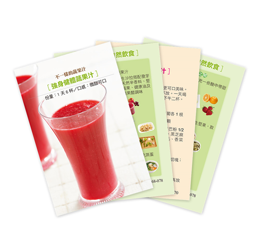 ☆☆ 隨書附贈一套4張隨身保健備忘卡 ☆☆ 幫助您便於攜帶、採買食材、或打果汁時直接參考使用,不用再翻書查找漏了何種食材。內容有: