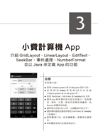 目前從 Google Play 上下載應用程式的次數已超過十億次!本書提供的內容可讓讀者快速地開發出傑出的 Android 應用程式,並發佈到 Google Play 上。本書是使用「以應用程式為導向」的教學法,每一項新的技術會融入到七個經過完整測試的 Android app 當中來介紹,其中搭配著語法標示,將重要的程式碼標出,以漸進的方式帶您寫出程式並觀察範例的輸出。讀者即將參與開發的應用程式包括: