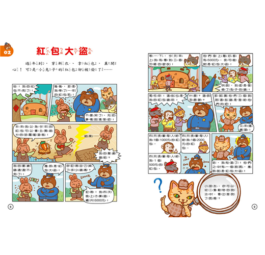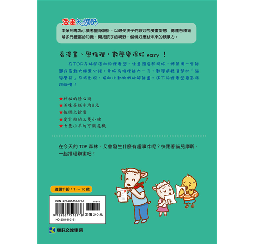 TOP森林的狐狸老闆生意頭腦超級好,老是用一些謎題或是盲點來大賺黑心錢,連主持正義的熊警長都差點上當了!幸好有推理能力一流、數學邏輯清楚的貓兒摩斯及時出現,協助小動物們破解謎團。這下狐狸老闆要氣得跳腳嘍!