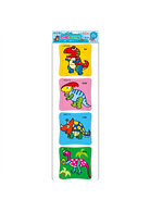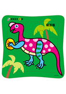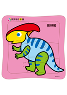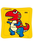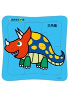 本產品正面是四隻白堊紀的恐龍(暴龍、三角龍、副棘龍、竊蛋龍),包含4、5、6、7等四種片數拼圖,背景則是塗色遊戲。拼圖色調鮮明,造型可愛,可讓孩子從拼合過程中了解部分與整體的概念,訓練手部小肌肉的發展,增進手眼協調、圖形辨識、邏輯思考等能力。