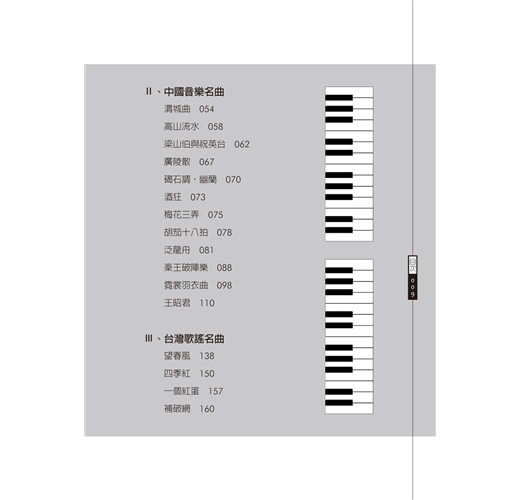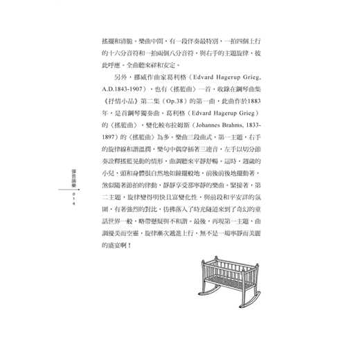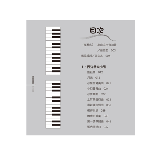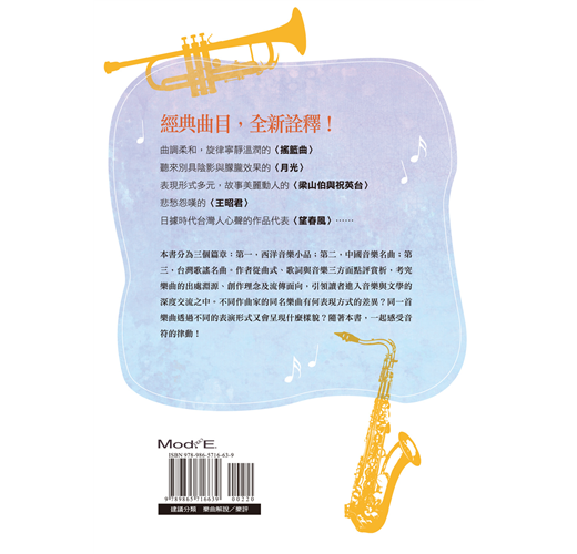 本書分為三個篇章:第一,西洋音樂小品;第二,中國音樂名曲;第三,台灣歌謠名曲。作者從曲式、歌詞與音樂三方面點評賞析,考究樂曲的出處淵源、創作理念及流傳面向,引領讀者進入音樂與文學的深度交流之中。不同作曲家的同名樂曲有何表現方式的差異?同一首樂曲透過不同的表演形式又會呈現什麼樣貌?隨著本書,一起感受音符的律動!
