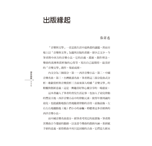 「音樂與文學」一直是我生活中最熟悉的議題,然而市場上以「音樂與文學」為題所出版的書籍,卻少之又少。今筆者將中西方的音樂小品,它的出處、淵源、創作理念、樂曲的流傳和賞析後的心得等,寫出自己最期待、最美好的「音樂文學」創作,集結成冊。