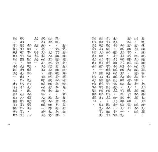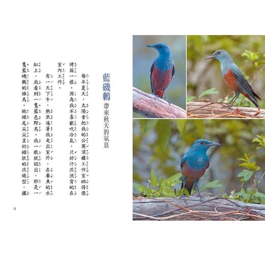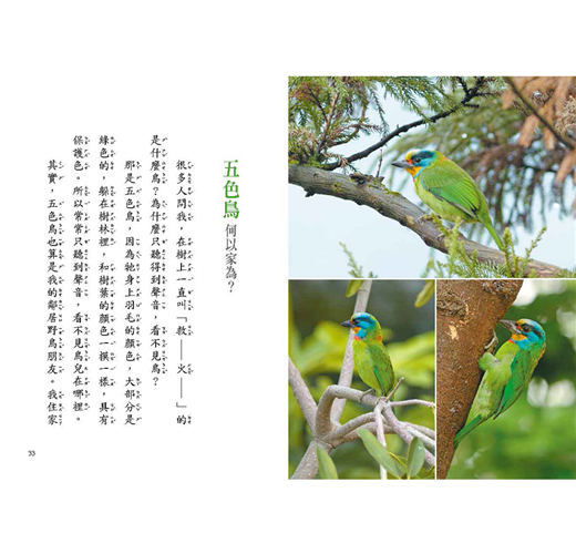 在我年幼時,大人總是告訴我,小鳥就是麻雀,大鳥都是老鷹。有一天我在公園的椅子上遇見一隻彩色鳥,又在家裡院子的莿桐上看見綠色的鳥。上學時,我把這個大發現告訴同學,不但沒有引起共鳴,甚至有人覺得我眼睛有問題。