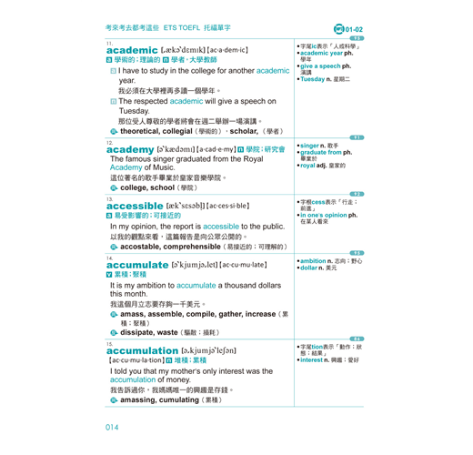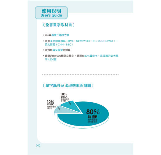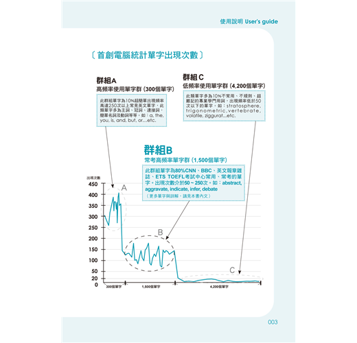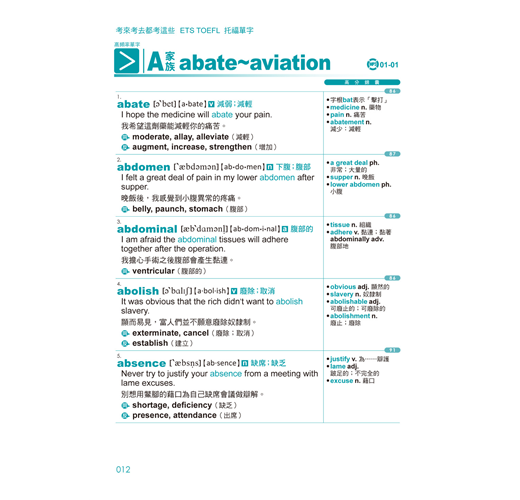 此群組單字為80%CNN、BBC、英文報章雜誌、ETS TOEFL考試中心常用、常考的單字。出現次數介於50 ~ 250次。如: abstract, aggravate, indicate, infer, debate, ……更多單字與詳解,請見本書內文。