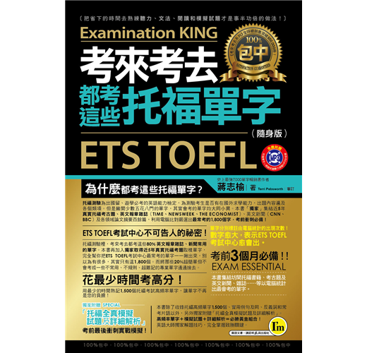 許多考生在面對英文考試時,總是花費了大半的精力在背單字上,但是,「背下來的單字真的會考嗎?」,幹嘛浪費一大堆時間去背7,000、10,000、12,000甚至15,000個單字。其實只要用最少的時間熟記《考來考去都考這些托福單字》中所列舉的1,800個單字,就可以輕鬆考高分。