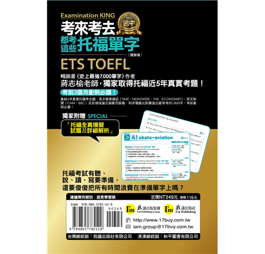 托福測驗為出國留、遊學必考的英語能力檢定,為測驗考生是否有在國外求學能力,出題內容遍及各個類項。但是撇開這些少數五花八門的單字,其實會考的單字均大同小異。本書「獨家」集結近5年真實托福考古題、英文報章雜誌(TIME、NEWSWEEK、THE ECONOMIST)、英文新聞(CNN、BBC)及各領域論文摘要百餘篇,利用電腦比對嚴選出最常考的1,800字,考前衝刺必備!